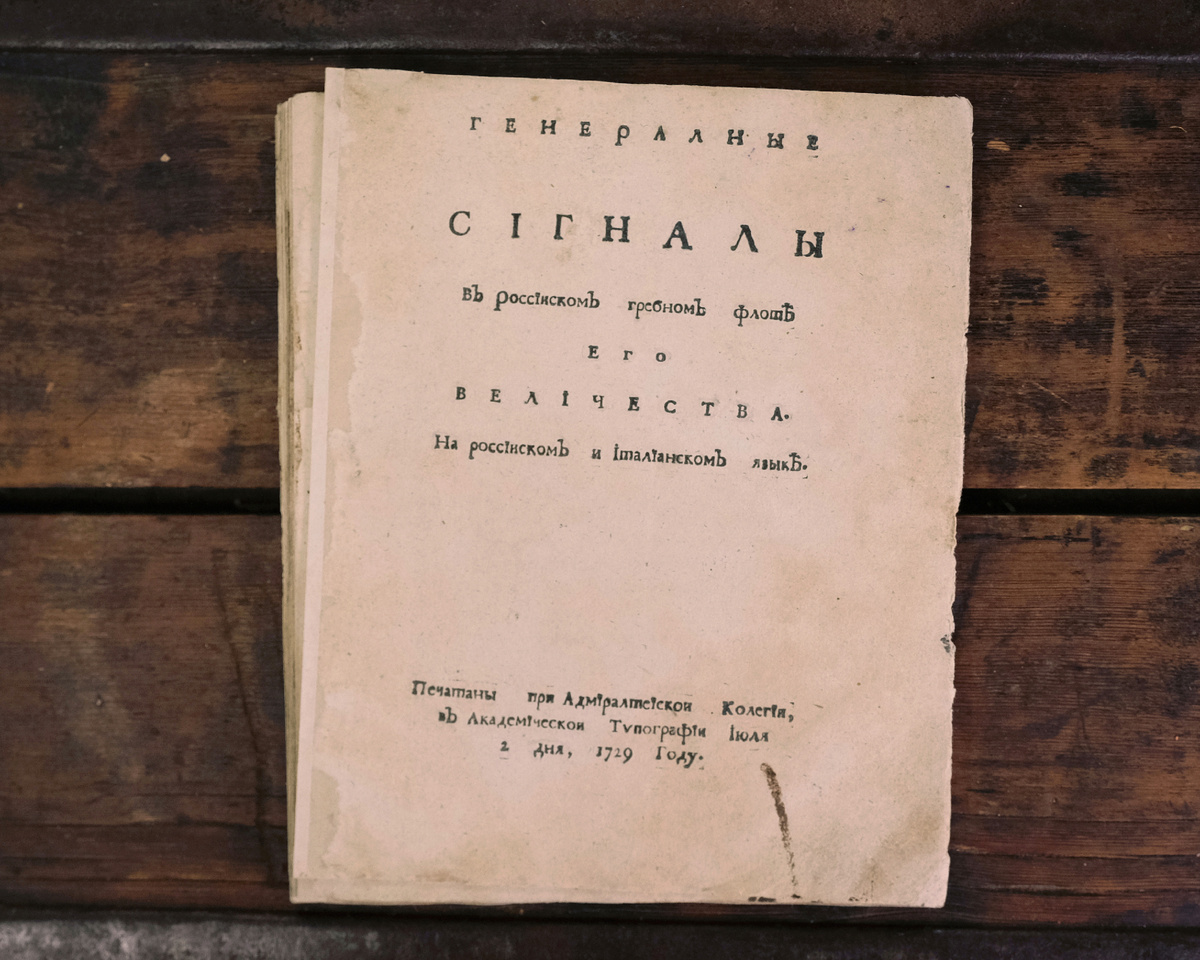 Издание, пришедшее в мастерскую на реставрацию, невероятно редкое и ценное. Называется оно «Генеральные сигналы в российском гребном флоте Его Величества на российском и итальянском языках» и выпущено аж 296 лет назад – в 1729 году. Нашей задачей стало бережное восстановление антикварного издания. Переплёт не сохранился, поэтому страницы оказались загрязнёнными и стёртыми по краям срезов. Страницы когда-то скреплял клей, который давно рассохся и уже не выполнял своих функций. Для переплёта мы решили использовать кожу эпохи выхода издания. Такие материалы бережно хранятся в коллекции нашей мастерской. Для такой редкой книги обязательно нужно было изготовить твёрдый переплёт, что мы и сделали. А на корешок нанесли золотистое тиснение с кратким названием издания и вензелями, которыми обычно украшались книги в XVIII веке. Теперь книга выглядит целостно и, что ещё важнее, сохранится в домашней библиотеке ещё на сотни лет. В 1700-х годах российский гребной флот Петра I и его преемников испол
