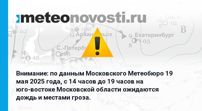 Внимание: по данным Московского Метеобюро 19 мая 2025 года, с 14 часов до 19 часов на юго-востоке Московской области ожидаются дождь и местами гроза. Перейти на сайт Прогноз погоды на 14 дней