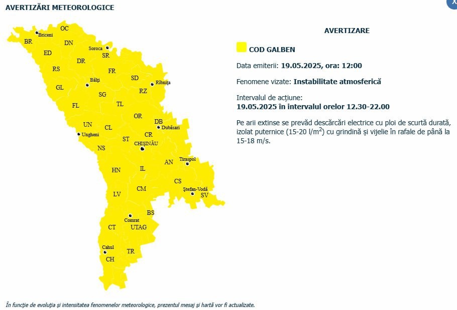 ⚡️🇲🇩Внимание! В Молдове объявили желтый код из-за нестабильной атмосферы. Ожидается гром, кратковременные сильные дожди, град и порывы ветра 15-18м/c. ☝️😐 Предупреждение действует сегодня с 12.30 до 22.00. @eNewsmd.online 👈 Подписывайтесь на наш канал