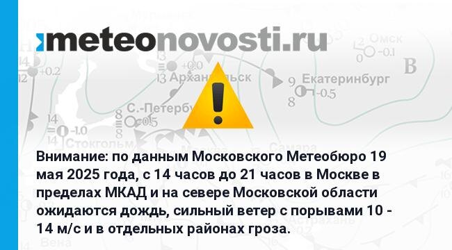 Внимание: по данным Московского Метеобюро 19 мая 2025 года, с 14 часов до 21 часов в Москве в пределах МКАД и на севере Московской области ожидаются дождь, сильный ветер с порывами 10 - 14 м/с и в отдельных районах гроза.