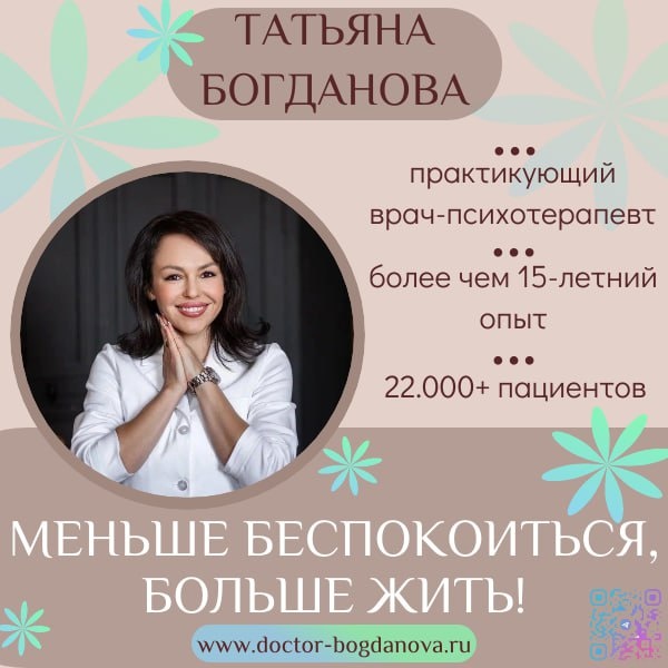 💜За последние дни наше сообщество выросло, и я хочу поприветствовать новых подписчиков! 💜 Многие, возможно, не знают, кто я. Ребята, давайте знакомиться и сейчас немного расскажу о себе. ⬇️ 💌 Меня зовут Татьяна Геннадьевна Богданова, и я практикующий врач-психотерапевт с более чем 15-летним опытом. За это время я помогла 22.000+ пациентов обрести душевное равновесие, избавиться от страхов и начать новую жизнь. 🖇️ Мое высшее медицинское образование началось в Воронежском государственном медицинском университете имени Н. Н. Бурденко в 2010 году. И после я постоянно развиваюсь, проходя повышение квалификации в ведущих институтах России и мира. Мои тренинги охватывают широкий спектр методов, включая когнитивно-поведенческую терапию, краткосрочную позитивную психотерапию, современную клиническую гипнотерапию, схематерапию, терапию принятия и ответственности и другие... 📌 ПОВЫШЕНИЕ КВАЛИФИКАЦИИ: ✔️ Воронежский государственный медицинский университет имени Н. Н. Бурденко. Врач-псих