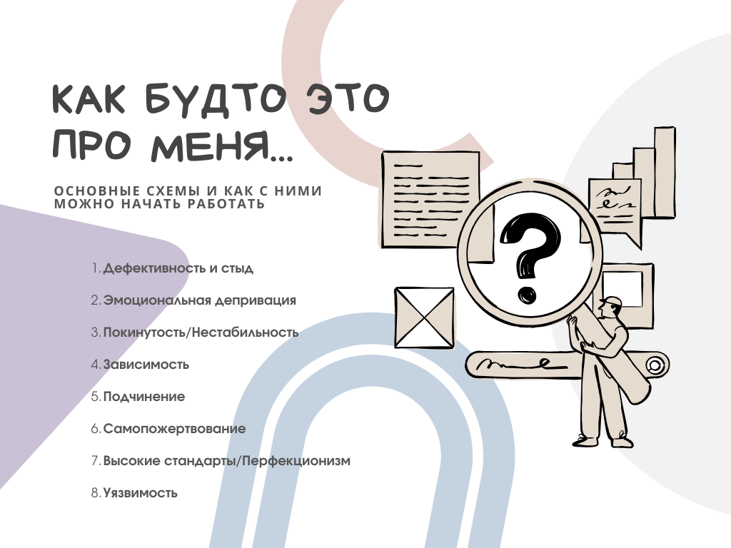 Как будто это про меня...Основные схемы и как с ними можно начать работать Когда вы впервые читаете описание психологических схем, часто возникает странное ощущение: "Так это же буквально про меня…" И одновременно - облегчение (наконец-то это имеет название) и тревога (что теперь с этим делать?). Схемы - это не диагнозы и не приговор. Это просто узоры внутри вас, которые сформировались, когда вы старались адаптироваться к опыту, часто ранимому, но неизбежному.