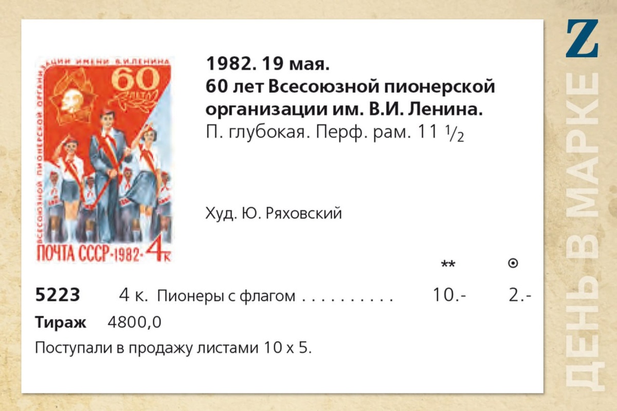 День в марке. 19 мая. День пионерии. В СССР этот день носил название День Всесоюзной пионерской организации имени Ленина. История праздника началась 19 мая 1922 года, когда на II Всероссийской конференции РКСМ была создана пионерская организация для детей 9-14 лет. Руководил движением Всесоюзный Ленинский коммунистический союз молодежи (ВЛКСМ) под контролем КПСС. После распада СССР в 1991 году организация была упразднена вместе с официальным статусом праздника. На смену пришли неполитические детские движения.