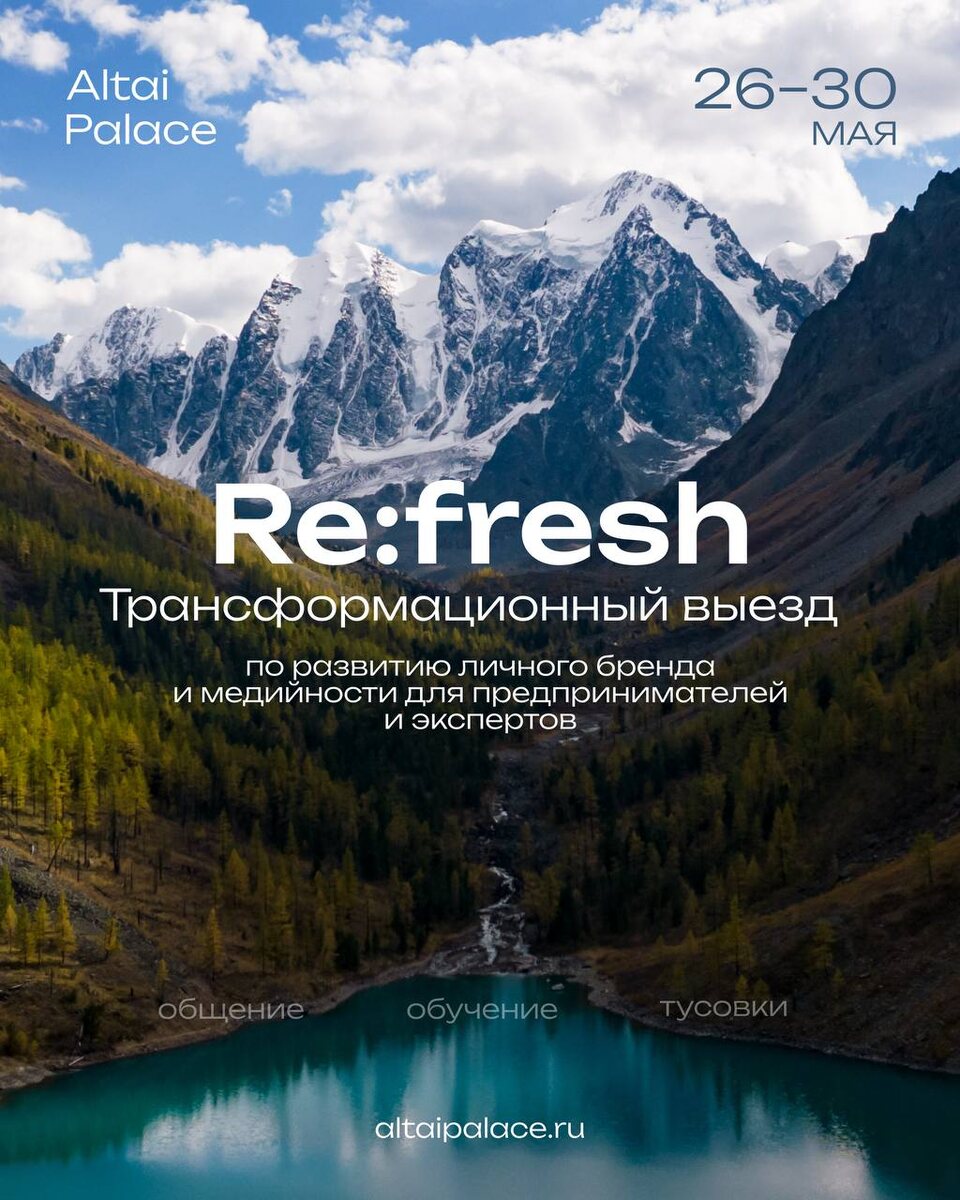 С 26 по 30 мая в Altai Palace пройдет грандиозный трансформационный выезд Re:fresh 🌪️ Участники выезда смогут прокачать свой скилл по развитию личного бренда и медийности обучаясь и перенимая опыт у ведущих лидеров рынка 🌟 Что будет? 🧘🏼♀️ Утренние практики 🎤 Разборы и лекции от приглашенных спикеров (на темы развития личного бренда и медийности) 🎉 Вечерние шоу и песни под гитару 🪩 Тематические вечеринки, кофейный рейв, командные игры 🏔️ Впечатляющая природа Горного Алтая! 💡 За 5 дней участники получат не только знания от успешных предпринимателей и спикеров, но и новых клиентов, партнеров и друзей! Свобода, нетворкинг и потрясающая природа Алтая! Что входит в стоимость? Проживание, завтраки, развлекательная и образовательная программы, трансфер в день заезда (26 мая) и в день отъезда (30/31 мая): аэропорт-отель, отель-аэропорт ✈️ Не упустите свой шанс принять участие в масштабном событии, которое перевернет ваше сознание и подарит невероятное количество положительных эмо