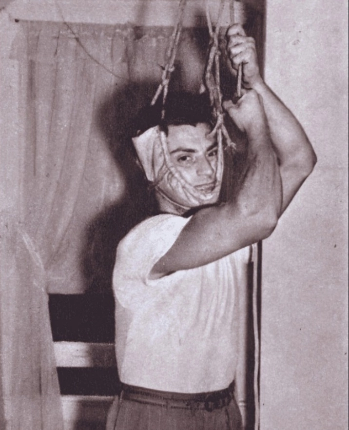 На этом фото Джино Франческини запечатлён во время попытки растянуть свою шею. В те годы в пожарные принимали только тех, чей рост был не ниже 170 см. Но Джино, чей рост составлял всего 168 см, очень хотел воплотить свою мечту в реальность. Каждый день он усердно тренировался, стараясь вытянуть шею, и в конце концов у него это получилось! Однако на медкомиссии выяснилось, что ему всё равно не хватает примерно 5 см. По легенде, чтобы компенсировать этот недостаток, Джино ударился головой о стену и получил шишку, которая и добавила ему недостающие сантиметры. Несмотря на все трудности, его настойчивость и желание работать в пожарной службе были вознаграждены: его всё же приняли на работу! Таким образом, этот человек, несмотря на все препятствия, осуществил свою мечту. А на что готовы вы ради своей мечты?