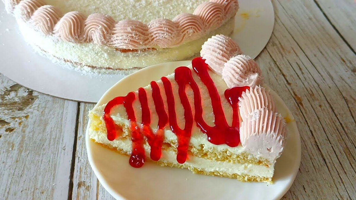Бисквит. Крем: Пропитка: Обсыпка: Декор: Общий выход готового изделия составляет 1.1 кг. Пищевая ценность продукта на 100 грамм: Яйца вымешиваю на высоких оборотах миксера с сахаром и солью. Добавляю сметану, кокосовую муку и разрыхлитель. Перемешиваю. Выкладываю тесто в форму выстеленную пекарской бумагой. Форму с тестом убираю в заранее разогретую до 170С духовку 30 мин. Творог пробиваю погружным блендером со сгущённым молоком. Сливочное масло вымешиваю с сахарной пудрой. В сливочное масло добавляю творожную основу и ванильный экстракт. Вымешиваю миксером. Не вмешанные остатки снимаю со стен чаши силиконовой лопаткой. Окончательно перемешиваю миксером. Вот такой гладкий творожно-сливочный крем получился. Остывший бисквит убираю в холодильник. Для сиропа. В сгущённое молоко вливаю крутой кипяток. Перемешиваю. Холодный бисквит разрезаю на два коржа. Выкладываю первый корж срезом вверх. Пропитываю сиропом. Просаливаю корж кремом формируя кремовый бортик. Выравниваю торт волшебной палетк