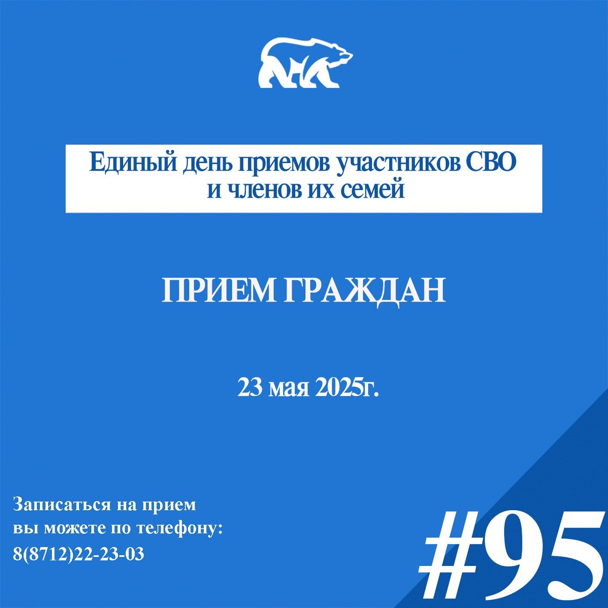 🚩23 мая 2025г. в Региональной общественной приемной Председателя Партии «ЕДИНАЯ РОССИЯ» Д.А. Медведева и местных общественных приемных Партии пройдет Единый день приемов участников СВО и членов их семей. ✍🏻Записаться на прием или задать вопрос устно можно: ⠀ ☎️ по телефону: 8 (8712) 22-23-03 ⠀ 📩 Отправив обращение по почте: 364021, г. Грозный, пр. А. Кадырова, 3/25, Бизнес-Центр, 4 этаж или бросить в почтовый ящик для письменных обращений на 1м этаже Бизнес - Центра. ⠀ 📥 Также направить письменное обращение по электронной почте: op@chechen.er.ru ⠀ #ЕдинаяРоссия #ЕРпомогает95 #ЕР95