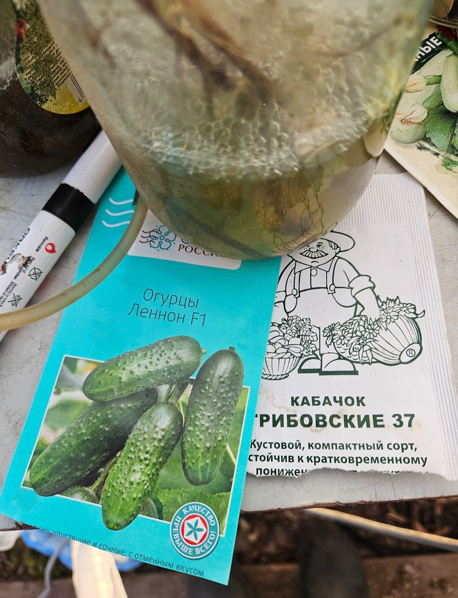 Ничего сверхважного и отчаянно смелого за сегодня не выполнялось. Про семена не забыла, запустила в барботацию новые партии огурцовых детей, добавив к ним наследников кабачковых. В одной банке будут в сотоварищах черенков от жимолости, присланной из Пензы. Красивая листва, цветная у этой лианы. Санна, я не специально ломала, они сами, в процессе движения между пунктами пересылки, надломались. Выбрасывать? А почему бы не побарботировать через бульки? Вторая банка приняла в компанию к черенкам клематиса Павел Иоанн другие сорта детей огурцовых и кабачковых. Банки стоят, воздух подаётся, пройдемте на участок. Что за беда? Почему склонили головы? Вид крайне плачевный и гиблость на лицо. Недалеко второй в том же состоянии. Что за напасть? Завяли? Нехватка воды? Шланг, вода, подземная ТРАНШЕЯ - залить, уплотнить, поорать на зверьё коричневое и слепое. Толку-то - ноль! Понаблюдаем. Это привет для Ляли из 2023 года - присланные ею сеянцы морозника чёрного весело машут ладошкой в раскрытии.