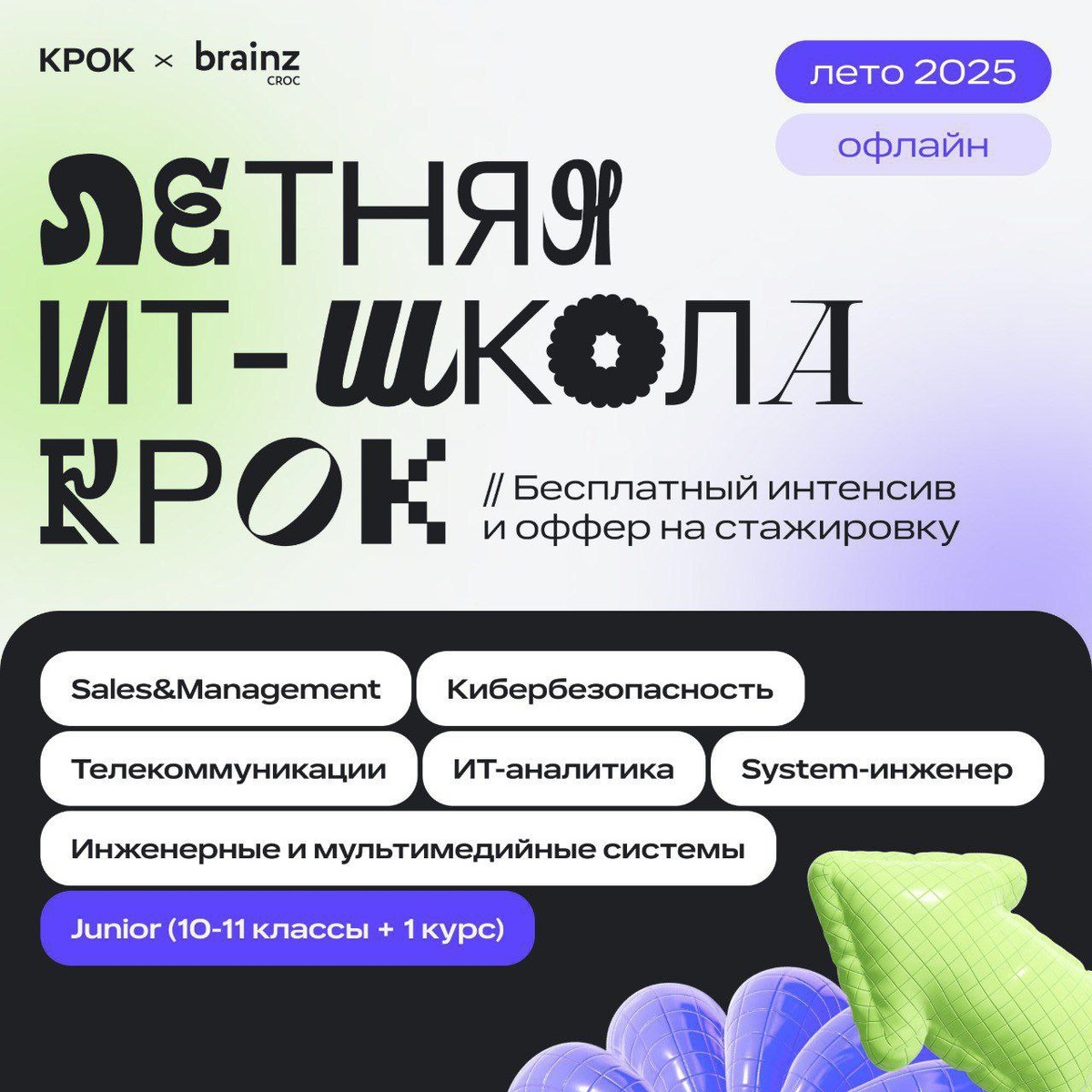 Что делать? Записаться на Летнюю ИТ-школу от КРОК 💛 🟨 За две недели погрузишься в одну из ИТ-профессий, прокачаешь скиллы и получишь возможность оффера в КРОК 🟨 Направления этого сезона: — System-инженер — Телекоммуникации — Кибербезопасность — ИТ-аналитика — Sales&Management — Инженерные и мультимедийные системы — Junior (трек для 10-11 класса и студентов 1 курса) 🆕 🟨 Ты точно готов стать участником ЛШ, если: Учишься в универе или выпустился в 24-25 гг. (или проходишь по критериям Junior) Готов приезжать в московский офис КРОК Хочешь стартовать карьеру в одном из образовательных треков Что ещё сделать?😋 1. Включить уведомления в канале. 2. Пригласить своих знакомых подписаться на канал @stud_career 3. Начать строить своё светлое будущее💛