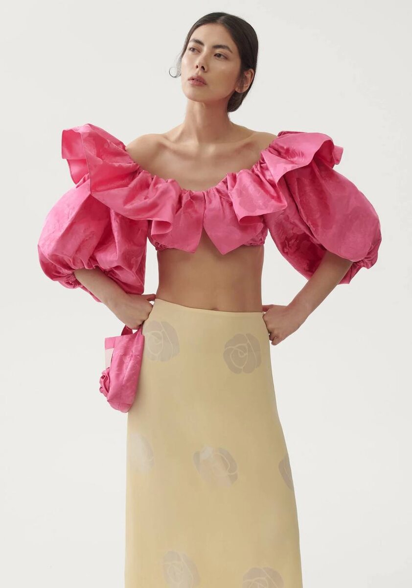 Сумка-мешок My812 — вещь, которую сначала рассматриваешь, а потом уже не представляешь ни один свой образ без неё. Яркий розовый цвет, фактурная ткань, аккуратная роза и узел на ручке — немного яркости в эту непонятную в плане погоды весну.