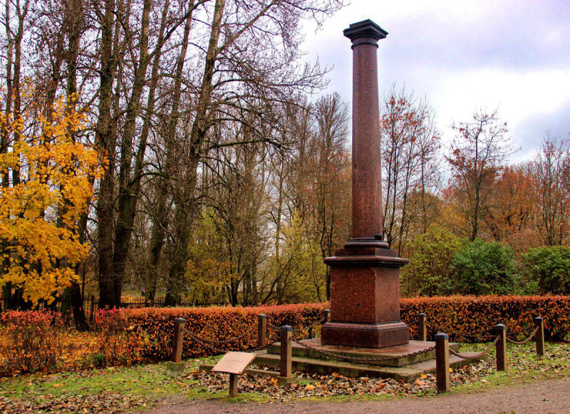 У входа в Екатерингофский парк стоит шестиметровая колонна из красного гранита, которая, согласно официальной версии, является произведением Огюста Монферрана. Установлена она была в парке в 1824 году с таким расчетом, что завершает спрямлённый участок дороги у Молвинского моста. Колонну именуют Молвинским столпом и размещается она рядом с Молвинским мостом через Таракановку, недалеко от ее впадения в Екатерингофку. Название свое колонна получила в честь Якова Николаевича Молво (7 августа 1766 - 22 мая 1822), потомственного дворянина, 1-й гильдии купца, владельца фирмы «Молво». С середины 1815 г. по 1818 г. он состоял в должности петербургского городского головы. Мост был назван в его честь, и колонна тоже. Согласно одной из версий эта колонна послужила О.Монферрану прототипом знаменитой Александровской колонны. А другая версия гласит, что сюда привезли одну из «запасных» колонн, которые использовались при перестройке О.Монферраном Исаакиевского собора. Как мне удалось выясн