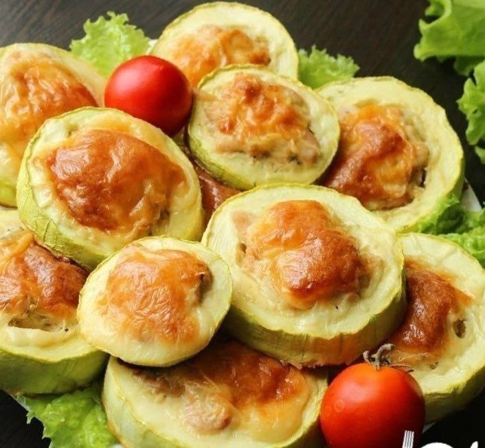 ▫️Куриную грудку мелко режем и добавляем чеснок, укроп, яйцо, соль и специи. Перемешиваем и складываем в серединку кабачка. Сверху крошим мелко нарезанный 🍅 или нарезаем его тонким кружком и посыпаем тёртым сыром.