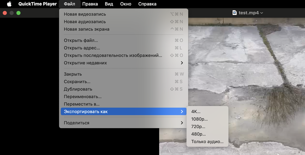 В macOS для сжатия можно воспользоваться QuickTime Player. Встроенный в операционную систему проигрыватель воспроизводит ограниченное количество форматов, зато для поддерживаемых без сторонних кодеков .mov и .mp4 в нём есть встроенный компрессор.