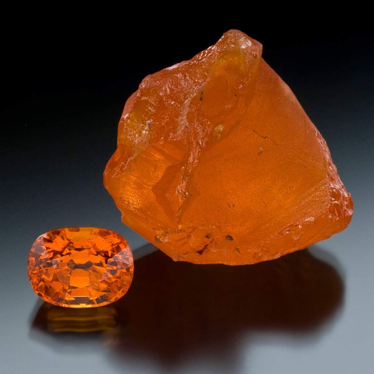 Спессартин — один из представителей семейства гранатов, ставший известным в 1832 году. Само его название – отражение географической привязки: минерал был обнаружен в горном массиве Шпессарт, расположенном на территории Баварии. Но пик популярности этого минерала пришёлся в конце ХХ века после открытия месторождения в Нигерии и Намибии. Подтверждением повышенного интереса к спессартину служит его активное использование ведущими мировыми ювелирными домами: Van Cleef & Arpels, Tiffany & Co, Harry Winston, Louis Vuitton и многимидругими. Цвет камня напрямую связан с химическим составом и может варьироваться от оранжевого до темно-красного, красновато-коричневого, оранжево-розового, оранжево-красного, коричневато-желтого и иногда почти черного. Однако наибольшую ценность представляют экземпляры ярко-оранжевого цвета, получившие коммерческий термин «Fanta». Спессартины, как и остальные гранаты, не подвергаются облагораживанию для улучшения цвета. Чаще всего спессартины содержат богатый