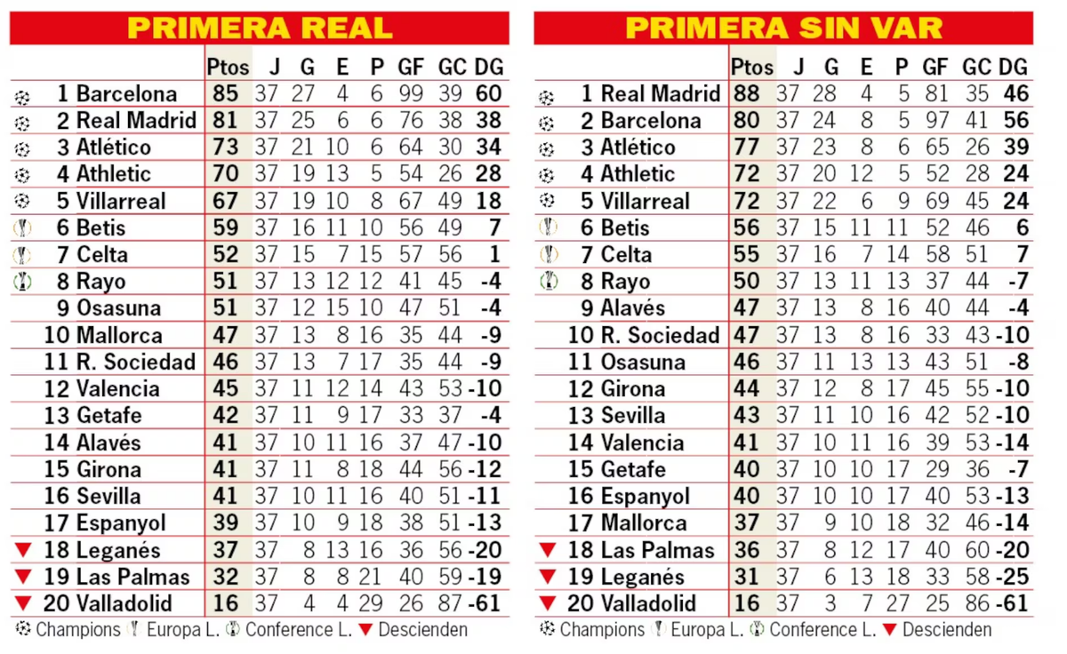 As представил таблицу чемпионата Испании без учета корректировок судейских решений при помощи системы видеоповторов.
