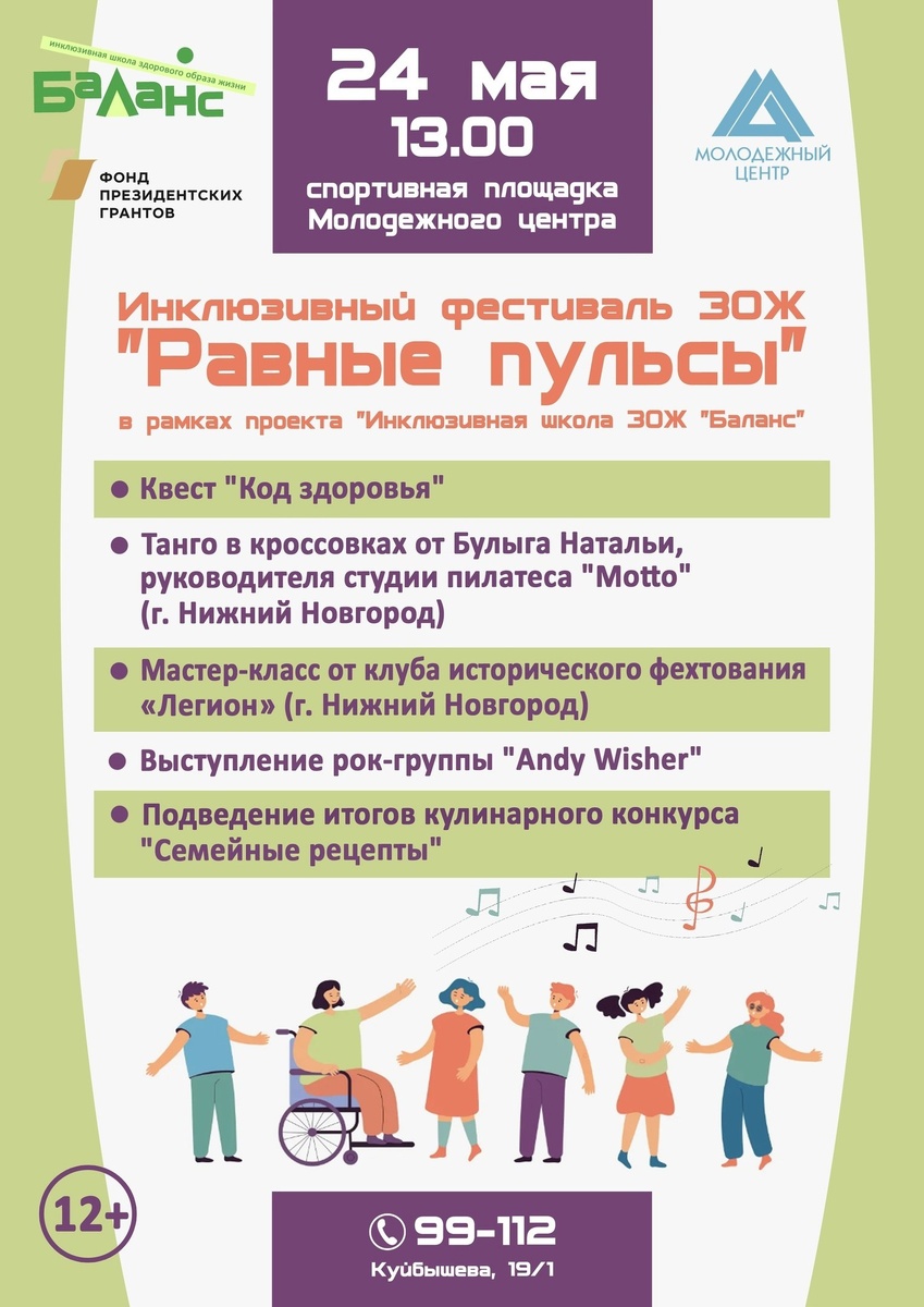↗ В Сарове пройдет инклюзивный фестиваль ЗОЖ «Равные пульсы» 24 мая на спортивной площадке Молодежного центра пройдет настоящий праздник спорта и ЗОЖ, объединяющий людей с ОВЗ и без ограничений со стороны здоровья. В программе фестиваля: ✅квест "Код здоровья" ✅ танго в кроссовках от Натальи Булыга - руководителя студии пилатеса "Motto" (г. Н.Новгород) ✅мастер-класс от клуба исторического фехтования "ЛЕГИОН" (г. Н.Новгород) ✅выступление рок-группы Andy Wisher ✅подведение итогов кулинарного конкурса "Семейные рецепты" Начало в 13:00. Вход свободный. 12+