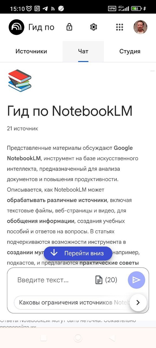 Как превращать любые источники информации в структурированные знания, обучаться, проводить исследованиях и создании контента с помощью ИИ? В чём сила NotebookLM? 🔥В точности и работе с предоставленными Большом объёме данными до 50 источников в любом формате (PDF, DOCX, TXT, URL, YouTube). Для работы нужно: - Google-аккаунт - Из России нужен VPN В NotebookLM есть 💬 Интерактивный чат, в котором можно: • Задавайте вопросы • Получайте ответы с цитатами • уточнять и просить объяснить проще ⚙️ Студия функций • Quick Overview — краткие сводки • Podcast — аудиообзор на основе документов 📝 Заметки • Сохраняйте важные фрагменты • Выбирайте формат: Study Guide, FAQ, Briefing • Добавляйте свои заметки вручную • Ментальные карты — визуализация взаимосвязей • Совместная работа — делитесь блокнотом, добавляйте участников • Мультимодальность — документы, видео, ссылки, аудио