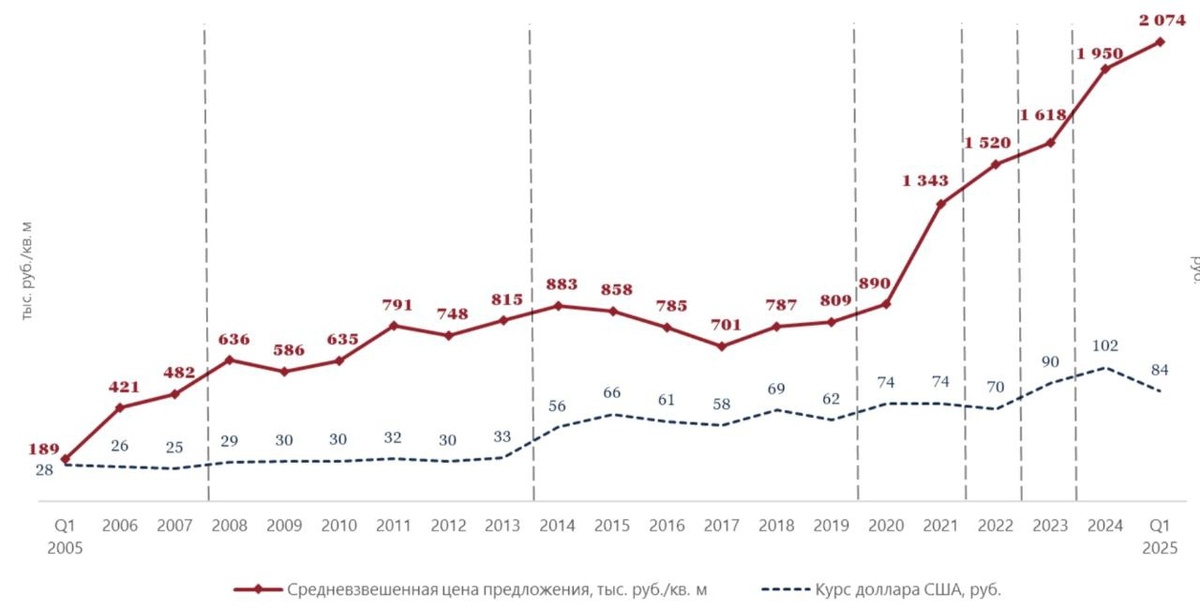 🚀 В прошлом году годовой прирост составил 21%, а в I квартале 2025 года средневзвешенная цена впервые преодолела отметку в 2 млн руб./м², установив новый исторический максимум (+30% г/г).