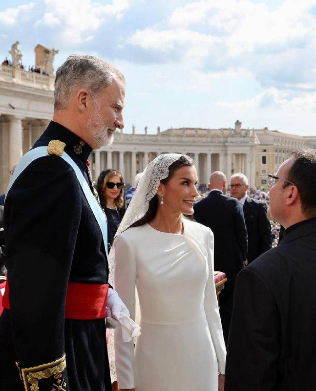 На церемонии супруги придерживались особого дресс-кода. Летиция примерила белое платье прямого кроя с длинными рукавами, которое она сочетала с бежевыми туфлями-лодочками на каблуках и белой кружевной мантильей на голове. Такой образ — привилегия монаршей особы. Дело в том, что королева Испании — одна из семи женщин в мире, которым разрешено носить белое на аудиенциях у Папы Римского, поскольку она является избранной католичкой из королевской династии.