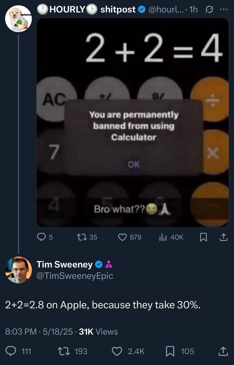 Глава Epic Games Тим Суини знатно протроллил Apple под мемом о бане пользователя в «Калькуляторе»