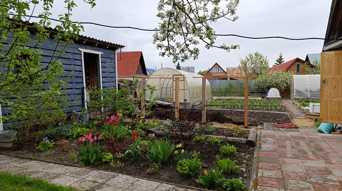 Дождик, спасибо ему, почти совсем не докучавший днём, разошёлся только к вечеру. И поэтому дал мне возможность кое-что сделать на участке. Во-первых, я высадила в грунт баклажаны. Вроде бы и рановато, но они так замучились бедняги в своих маленьких ёмкостях, что я поверила в неизменность прогноза и отправила их на улицу. Укрыв по дугам, конечно. Покончив с баклажанами, принялась за свою стройку. Долго ли коротко ли, а столбы я в землю врыла. При этом, выровняв их во всех плоскостях, что было не так уж и легко. Сейчас сверху лежат доски именно для того, чтобы я видела - ровны ли между собой верхушки столбов. Тропинка здесь идёт под уклон, но верх-то должен быть не по уровню земли, а по уровню, который инструмент). Может и есть расхождение, но не критичное - в полсантиметра, не больше.