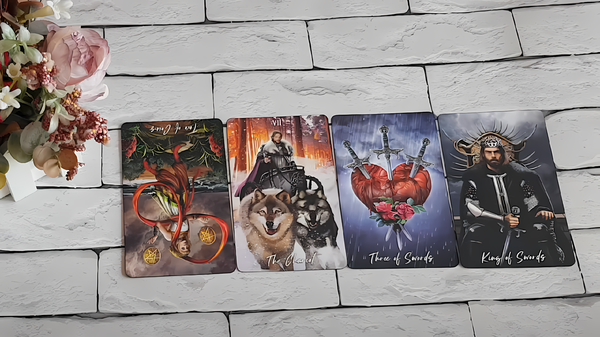 Двойка Пентаклей Перевёрнутая добавляет, что он игрок, скрытный, всегда играет какую-то роль. Двойка Пентаклей Перевёрнутая показывает, что его сердце может кровоточить, но он скрывает это за маской удали и молодецкой бравады. Он стремится вперёд, любит скорость, движение, как говорит Колесница. Колесница — это его жажда действия, гонок, динамики. Он не стоит на месте, но его холодность и принципиальность, описанные Королём Мечей, делают его сложным. Пятёрка Мечей и Девятка Жезлов рисуют его как воинственного, настырного, готового идти по головам ради цели. Но есть и другая сторона. Туз Кубков шепчет, что, если он любит, то отдаёт всё сердце. Под воздействием любви он оттаивает, становится ласковым, нежным, снимая свою маску. Король Мечей и Туз Кубков показывают контраст: он может быть жестоким, спорщиком, ревнивым, но в любви превращается в другого человека. Однако его принципиальность и аналитический ум делают его непробиваемым. Пятёрка Мечей предупреждает, что он может обидеть, быть резким, и его аргументы остры, как клинок. Это мужчина с перчиком, сложный, но притягательный своей силой.