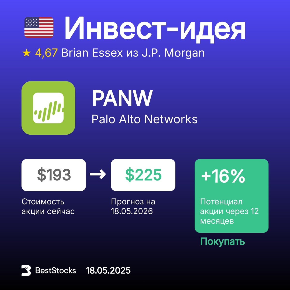 🇺🇸 Инвест-идея по акции Palo Alto Networks Тикер: PANW Прогнозная цена: $225 (+16%) Рекомендация: Покупать InvestRank акции: 10 из 10 Прогноз сделан: 18.05.2025 Прогноз до: 18.05.2026 Инвест-компания: J.P. Morgan Аналитик: Brian Essex Ещё рекомендации на сегодня → ••••• 🔥 Получайте более 400 свежих прогнозов по акциям каждый день. Выбирайте самый высокий потенциал, рейтинг аналитика, срок прогноза и биржу, где торгуется акция.