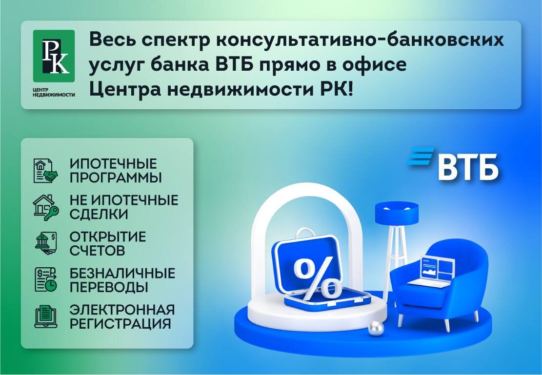 Эксклюзивное предложение от РК и ВТБ 🤝 Получите весь спектр консультативно-банковских услуг от специалиста ВТБ прямо в офисе Центра недвижимости РК! - Ипотечные программы - Не ипотечные сделки - Открытие счетов - Оформление кредитов - Безналичные переводы - Электронная регистрация 📌Индивидуально. Вовремя. Без очередей Сотрудник ВТБ будет консультировать в нашем офисе с 9:00 до 19:00 до конца мая. 📲 +7 978 110 86 38 — Центр недвижимости РК 📲 +7 800 505 38 25 - бесплатный звонок из любой точки РФ 📍Севастополь, Ул. Вакуленчука д.18В rcrealty.ru