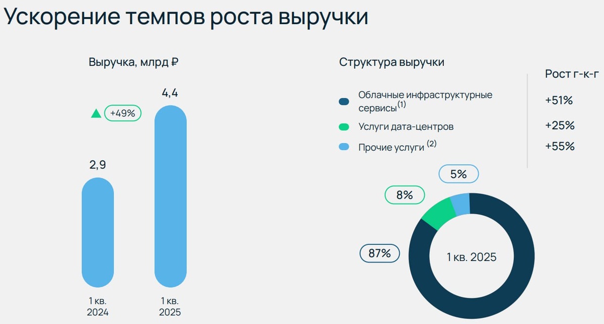 📊 Общая выручка компании за 1 квартал 2025 года выросла сразу на 49% год к году — до 4,4 млрд руб. И это не влияние роста «по всем фронтам», а результат уверенного масштабирования ключевого направления — облачной инфраструктуры, которая даёт 87% выручки. Именно