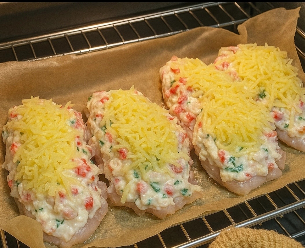 Готовила это блюдо на ужин — и с первого кусочка влюбилась! Мясо сочное, а шубка сверху — нежнейшая, с сыром, яйцом и пряностями. Очень советую попробовать, когда хочется быстро, вкусно и с изюминкой. ИНГРЕДИЕНТЫ: ✅ Куриное филе — 2 шт. (500–600 г) ✅ Лук — ½ шт. ✅ Помидоры — 2 средних (180 г) ✅ Варёные яйца — 2 шт. ✅ Сыр — 120 г ✅ Майонез — по вкусу ✅ Сметана — по вкусу ✅ Зелень — любая по вкусу ✅ Соль, чёрный перец, сухой чеснок, паприка — по вкусу ПРИГОТОВЛЕНИЕ: 1. Подготовка курицы: Филе разрезать вдоль, слегка отбить. Посолить и натереть специями: чёрным перцем, паприкой, сухим чесноком и по желанию приправой для курицы. 2. Приготовление начинки: Лук и помидоры нарезать мелкими кубиками. Варёные яйца натереть. Добавить тёртый сыр, сметану, майонез и рубленую зелень. Всё хорошо перемешать. 3. Сборка: На каждое филе выложить порцию начинки, слегка прижать. 4. Запекание: Выложить заготовки в форму. Запекать в духовке при 230°C около 15–20 минут до лёгкой румяности. СОВЕТ