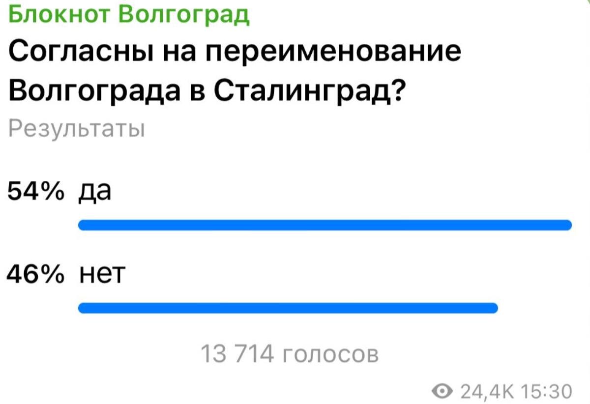 Резонансный опрос о переименовании города показал неожиданный результат: число поддерживавших смену названия Волгоград на Сталинград впервые превысило противников. Такие данные показал последний опрос «Блокнота». «Блокнот» не впервые проводил подобное исследование общественного мнения в своем телеграм-канале. Как правило, число противников переименования не спускалось ниже 67% — это официальные данные ВЦИОМ двухгодичной давности. В мае 2025 года согласие на переименование выразили 54% из числа опрошенных, против — 46%. Всего в голосовании зафиксировано 13 714 участников. По нашей информации, к поддержке голосования активно подключились сторонники КПРФ, а вот желающие оставить Волгограда в гонке проиграли. Не показывает энтузиазм и электронная петиция, созданная против переименования - ее подписало менее 0,25% жителей региона.