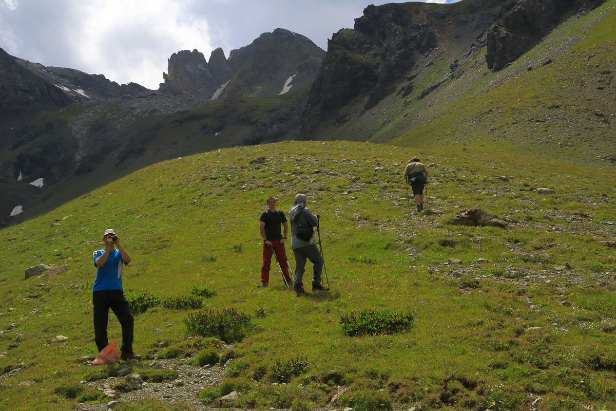 Предыдущая публикация ( https://dzen.ru/a/aCoLYNeqoFuewc4Z ) закончилась на том, что поставим лагерь у озера Провальное мы отправились на прогулку к озеру Лазурному, находящемуся под перевалом Семнадцати (1Б). В наш коллектив влился коллега из соседней группы. Подъем на вершину был не очень сложным, но в силу сыпучести, доставил некоторые неудобства ряду участников. К озеру мы прошли без тропы по склонам вершины 2820 м. Со склонов вершины открывался вид на ущелье озера Кяфар и наш лагерь у озера Провальное. Вид с вершины на завтрашний перевал Мыгвал и озеро Провальное Озеро Провальное С вершины открылся вид и на озеро Лазурное и перевал Семнадцати. Вид с вершины впечатлял, но погода начала портится. Спуск с вершины к озеру оказался проще подъема и цветочнее. Возле озера начал моросить дождь с градом и вся его лазурность куда-то делась Поэтому рассиживаться у озера мы не стали, а резво собрались в обратный путь. Правда, погоду это не убедило и град с дождем усилился. Хотя он и не был