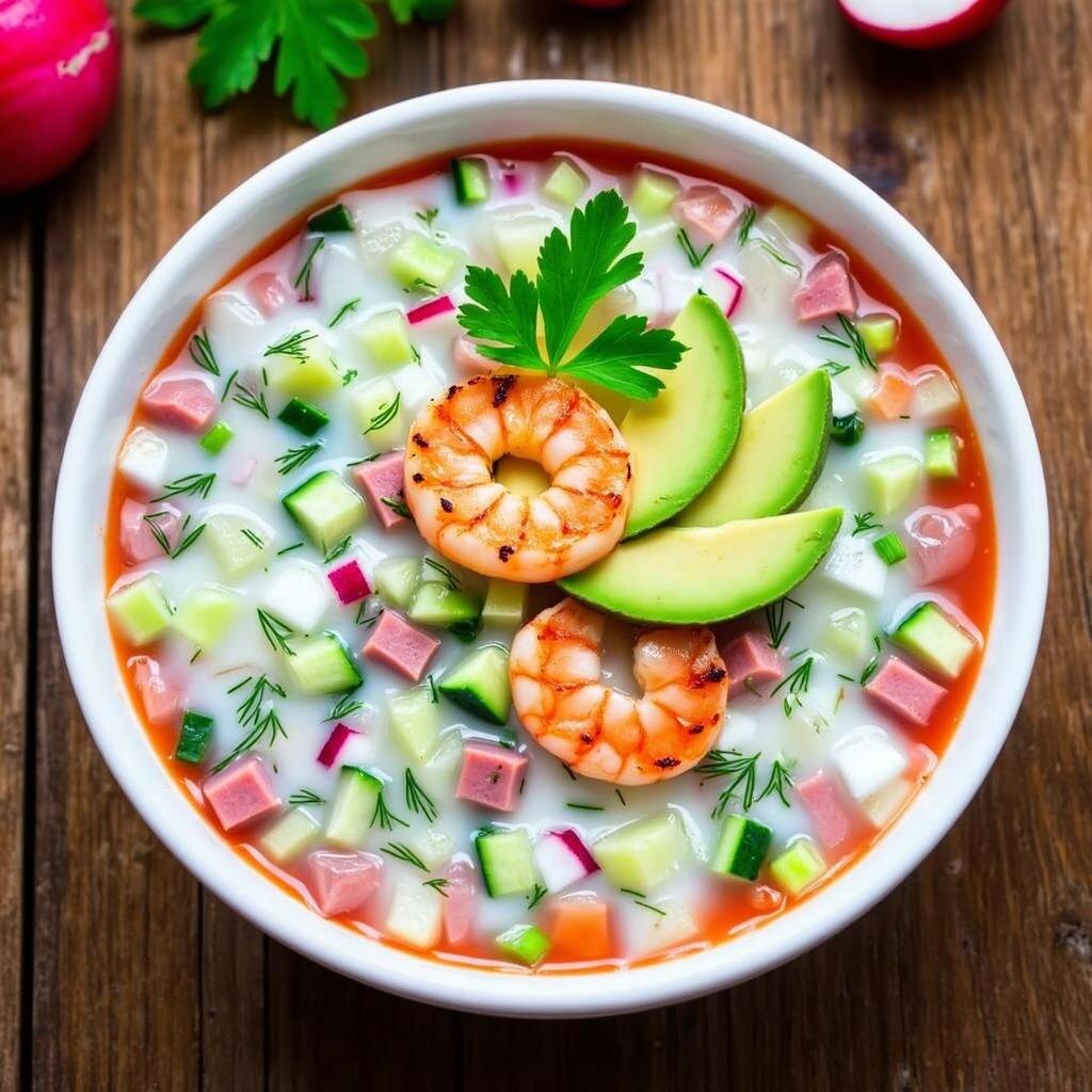 Окрошка — традиционное блюдо русской кухни, которое чаще всего ассоциируется с холодным супом на квасе или кефире. Однако этот рецепт предлагает новый взгляд на классику, используя свежие ингредиенты и необычный базовый ингредиент — томатный сок. Этот вариант блюда идеально подойдет для тех, кто хочет попробовать что-то новое и необычное. Ингредиенты: - Креветки — 200 г