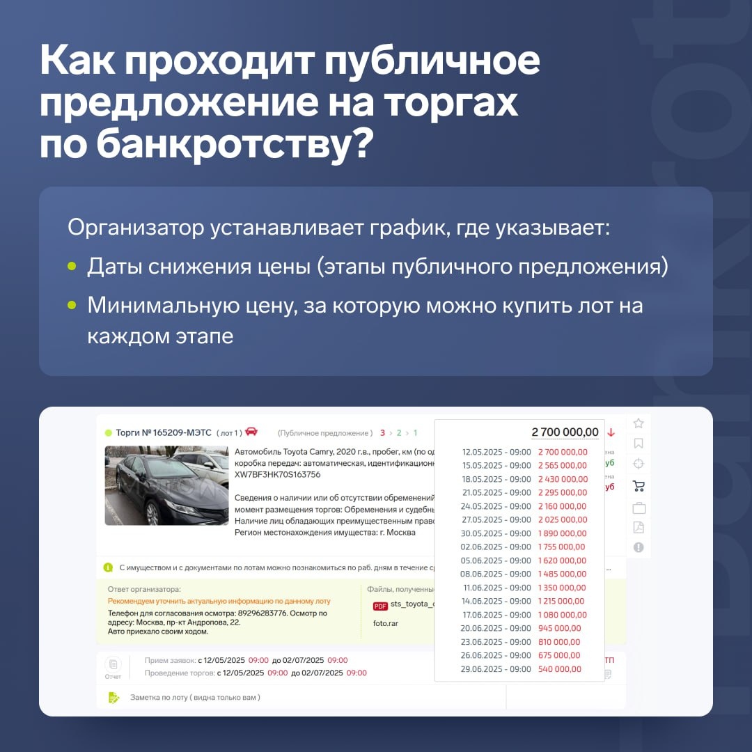 Публичное предложение — это форма торгов, при которой стоимость лота постепенно снижается.