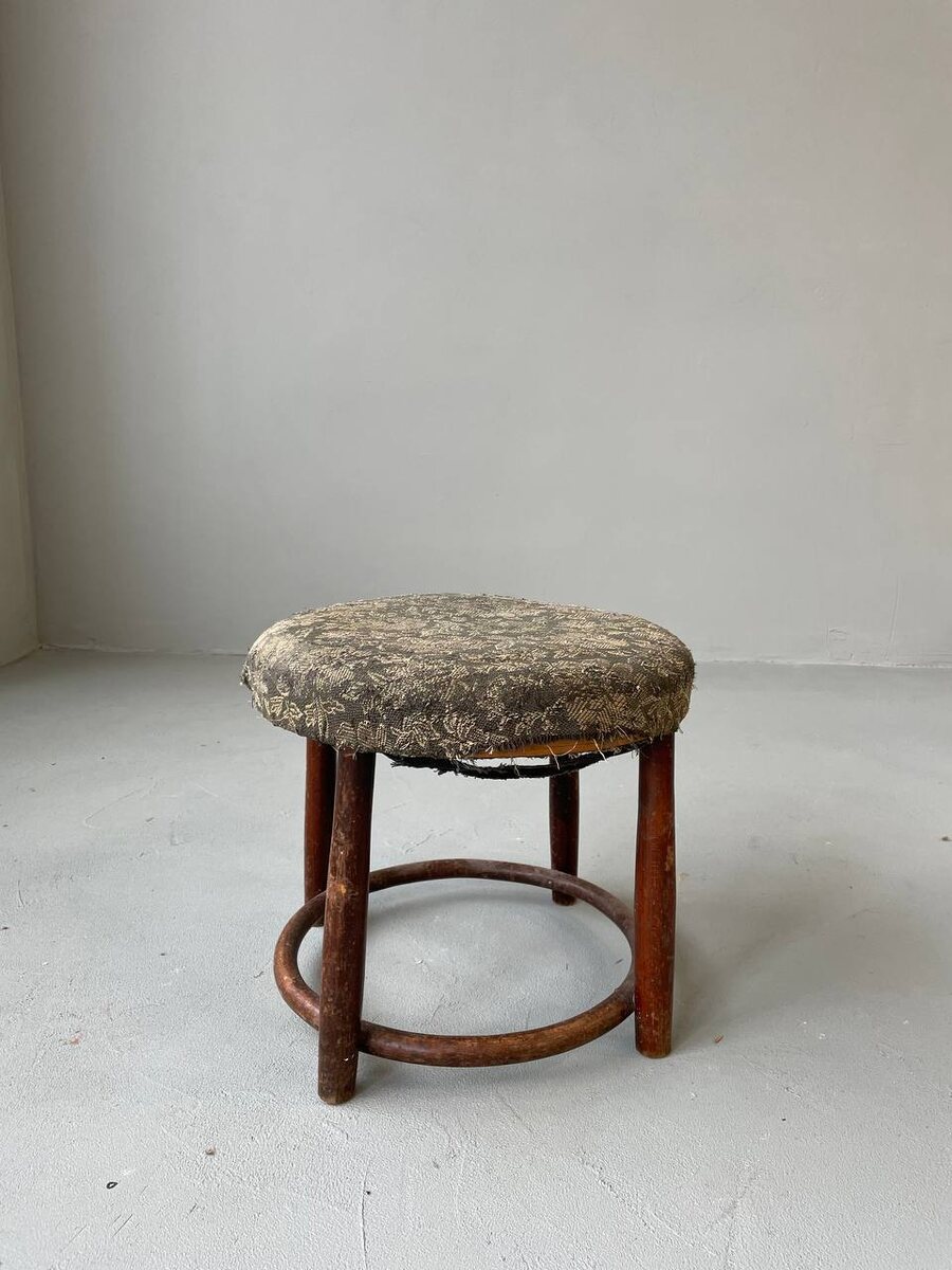 Эта банкетка была у нас в наличии. И её увидела среди других предметов в продаже наша постоянная заказчица Екатерина. Она решила ее выкупить и обновить, сиденье планировали оставить мягким, как и было в оригинале. Но у предмета были свои планы: когда мы начали разбирать банкетку, то под мягким сиденьем нас ждало деревянное сиденье с тиснением под кожу рептилии. Его глянцевая поверхность выглядела как настоящая кожа! В банкетке это сиденье было использовано как техническое, как основа под мягкую часть. Но эту неожиданную находку заказчица решила оставить и план с мягким сиденьем мы изменили на новый. Теперь перед нами стояли задачи: сиденье лежало изначально сверху обода, мы его утопили в обод, места креплений ножек к ободу были ничем не закрыты и выглядели грубо – мы сделали заглушки. Также решено было сместить проножку, обод между ножек, повыше. Кажется, в течение жизни банкеточке подпилили ножки и проножка выглядела негармонично, слишком близко к полу – мы её подняли. Мы всё почи