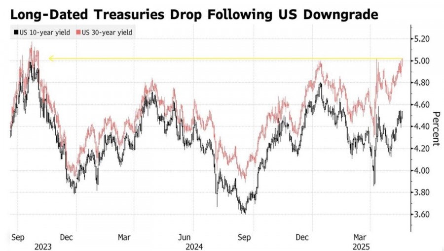https://basechop.ru/wordpress/?p=43180 От великого до смешного один шаг. От лозунга «купи Америку» до «продай американское» – не больше. И сделать этот шаг позволило снижение рейтинга США агентством Moody’s. Оно сослалось на растущий бюджетный дефицит, что подогрело интерес инвесторов к теме дедолларизации. Удар по гринбэку был нанесен по нескольким направлениям. Вердикт Moody’s спровоцировал рост как номинальной, так и реальной доходности казначейских облигаций. Для экономики, которая и так замедляется, это очень плохая новость. Для финансовых результатов американских корпораций – тоже. Затраты растут, прибыли снижаются. Все это в конечном итоге выльется в падение S&P 500. Вместе с ним рухнет и доллар США, который в последнее время иначе как рискованной валютой не назовешь. Динамика доходности облигаций США Одновременно решение Moody’s порождает червь сомнений относительно пролонгации Конгрессом пакета фискальных стимулов в виде снижения налогов, на что рассчитывает Дональд Трамп.…