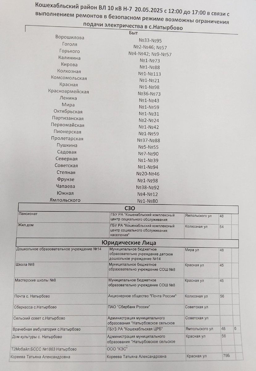 ❗❗20.05.2025г. в промежутке времени с 12:00 до 17:00 в связи с выполнением ремонтов в безопасном режиме возможны ограничения подачи электричества в с.Натырбово.