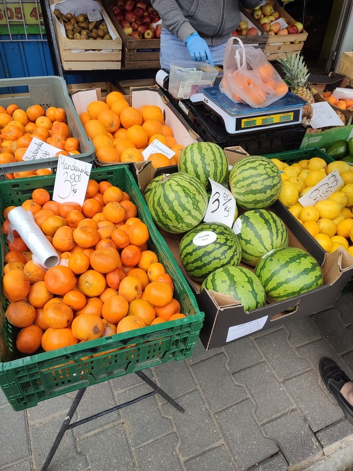 Вернулся опять к обзору цен в Польше. Хватит с меня этой политики. Уже и панамки закончились и вообще обещали удавить на границе. Вернусь к ценам. Цены в ларьке возле дома. В скобках будет в рублях. подозрительные мандарины по 3.90 (83) так же и арбузы стоят лимоны дороже 6.9 (147) Ежевика 1 (22) за упаковку 200 грамм. Нектарины 11 (234) твердые как камень. Манго 3.5 (74) за штуку но если взять 3 то будет по 2 (43). Манго вкусное взял три штуки, спелое сочное. Гранаты по 4.5 (95) за штуку. Гранаты почему то во всей Европе дорогие. Авокадо 3 (64) за штуку. Незнаю это дорого или нет. Клубника местная по 16 (340) но это ещё большая цена. Через неделю будет в два раза меньше. Только начало сезона же. Яблоки по 5 (107) виноград по 12 (255) за килограмм. Киви 8.9 (190) за упаковку в 1 кг. Стремные бананы по 4.9 (104) бананы в этом году тоже какие-то дорогие. Теперь овощи. Кстати в Польше фрукты это овощи а овощи важыва. Я пердоле. картоха 3.5 (74) свекла 5 (106) Помидоры 6.9 (146) перцы 9.9