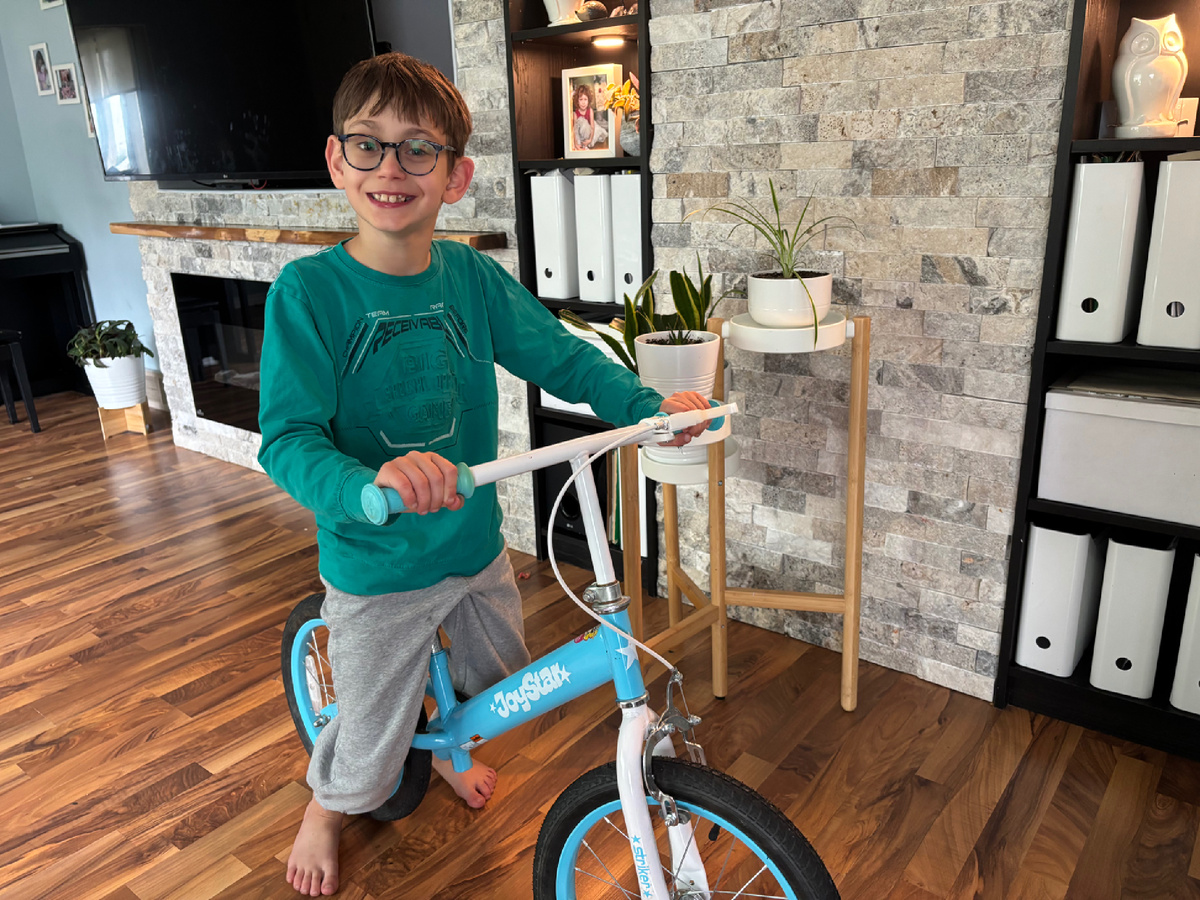 Когда Тим был еще малыш, стало понятно, что он никогда не научится кататься на велосипеде. У нас были и трехколесные и беговел. Ни один из них Тим не мог осилить. С чем это связанно я не знаю, но позже мне стало известно, что для многих детей-аутистов, велосипед - это что-то запредельно сложное. Не для всех, конечно. Но для многих. А в 5,5 Тиминых лет в нашей жизни появилась замечательная женщина, наш соцработник. Она была уже в возрасте. С большим опытом работы со сложными детьми. Плюс ко всему, ее уже взрослый сын тоже имеет диагноз аутизм. Он живет самостоятельно. Снимает квартиру. Работает (что-то связанно с компьютерами). Водит машину. Она рассказывала нам, как учила своего маленького сына кататься на велосипеде. И говорила, что Тим тоже может это сделать. А я не представляла, чтобы Тим смог держать руль и крутить одновременно педали. В конечном итоге, наша соцработник настояла на том, чтобы мы купили Тиму велосипед. И мы купили. С ней же мы и учили его кататься. Одна толкал