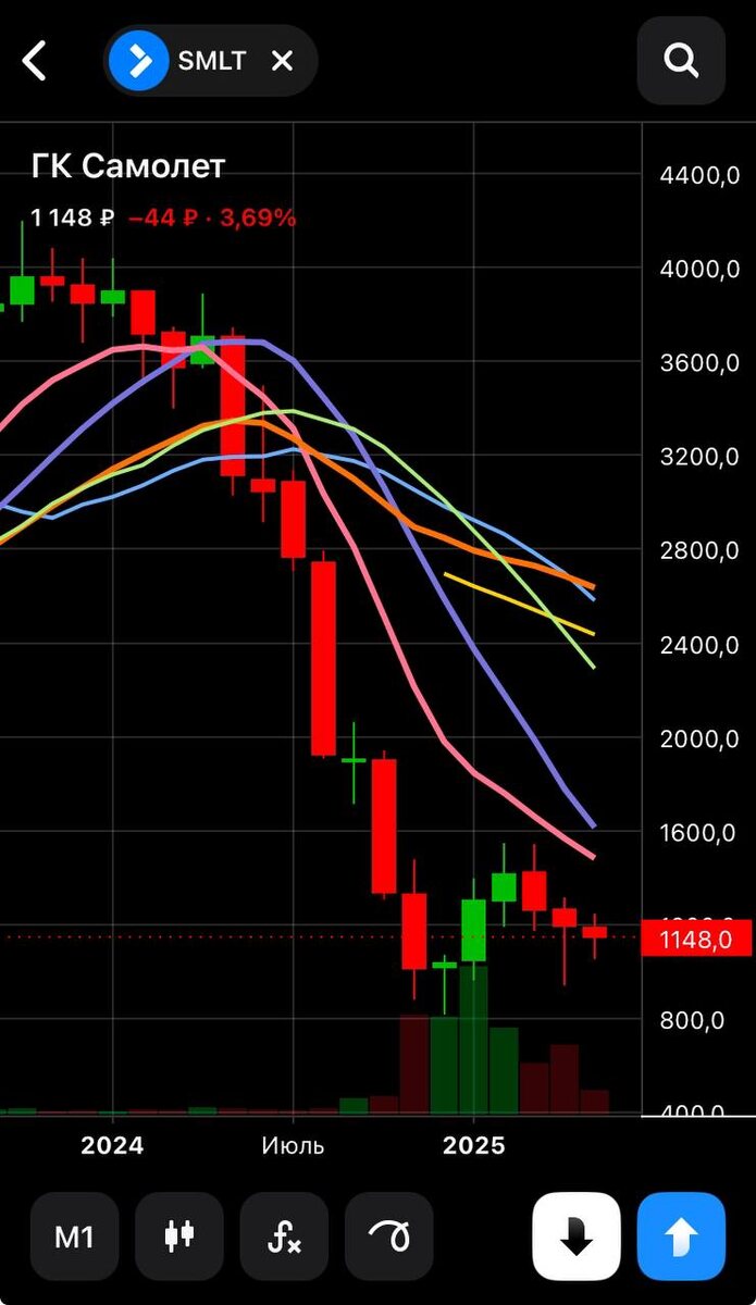 ПАО «ГК «Самолет»: движение вниз продолжается… Добрый вечер, Друзья! Снова кратко, но по делу. Привёл три графика: месяцы, недели, дни. На месячном и недельном графиках хорошо видно, что текущие котировки (свечи) находятся под всеми возможными скользящими средними. Это означает, что текущее положение дел в акциях эмитента определяет продолжающееся давление со стороны продавцов. На дневном графике провёл две жёлтых линии. Получилась фигура «Симметричный треугольник». Выход из него в одну из сторон с последующим закреплением определит приоритет дальнейшего движения цены. Вывод: сегодня для меня нет ни одной причины для открытия позиции в данном инструменте: ни в лонг, ни в шорт. #инвестирование #трейдинг #технический_анализ #паттерны #самолет