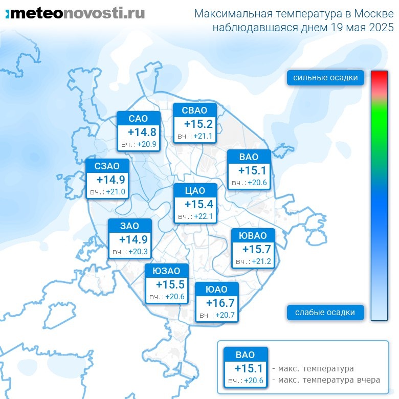 #за12часов #день Прошедший день 19 мая был на 5.3°C холоднее вчерашнего. Максимальная температура днём в Москве была на 3.7°C ниже нормы, что немного холоднее, чем обычно. Самая высокая температура +16.9°C была зафиксирована в 17 часов на юге города, а холоднее всего было на юго-западе: +13.2°C. Разница по максимальной температуре в разных частях столицы составила за день 3.7°C. Максимальные порывы ветра днём достигали 6 м/с. Атмосферное давление за день понизилось с 740 до 739 мм.рт.ст. Было без существенных осадков Самый теплый день в Москве 19 мая был в 1979 году, когда максимальная температура составила +30.2°C, а холодный в 1893 году: +6.6°C. Перейти на сайт Прогноз погоды на 14 дней
