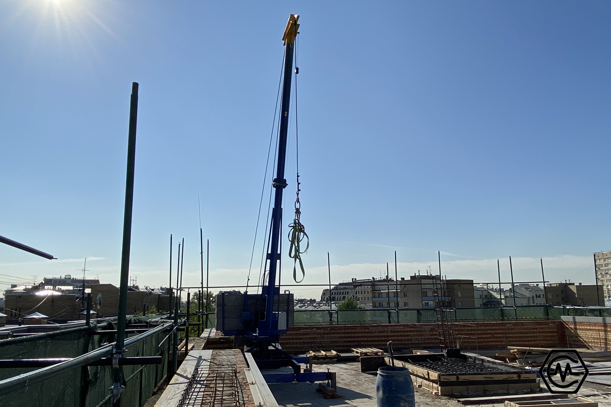 На последнем этаже планируется устройство мансарды. Для подъёма строительных материалов компания-застройщик приобрела у ООО «Станкомаш» кран «Пионер» грузоподъёмностью 1500 кг с электроповоротом стрелы. ►Подробнее с техническими характеристиками крана можно познакомиться на странице сайта: https://www.stankomasch.ru/catalog/show/106-krany-pioner/#l Кроме подъёма строительных материалов застройщик планирует подъём краном товарного бетона плотностью 2500 кг/м3 при помощи бадьи для укладки в опалубку. Объект находится в плотной застройке в центре Москвы. К тому же, по периметру здания устроены хомутовые леса, что могло создать дополнительные трудности для эксплуатации крана. Но, благодаря тому, что вылет в данной конструкции крана рассчитан на 4 метра, подъём любых строительных материалов на необходимую высоту осуществляется в соответствии с требованиями техники безопасности. Все члены нашей команды испытывают гордость за то, что нам удалось решить сложную техническую задачу. Чувство удов