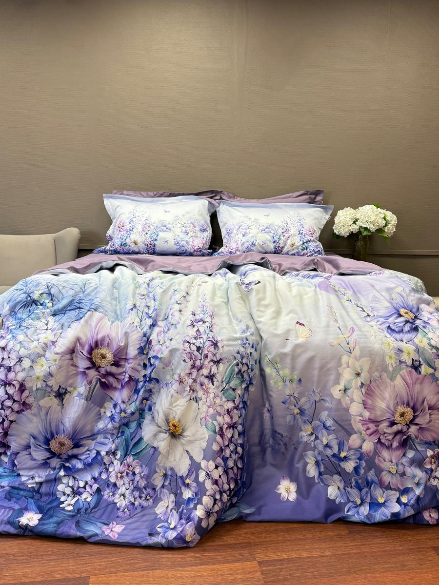 Манящая аметистово-сапфировая цветовая гамма, пышные соцветия дельфиниума разных оттенков, крупные маки с тончайшими лепестками и парящие над ними бабочки. Как только я увидела этот дизайн, поняла - нужно брать! Рисунок на пододеяльнике - это целая картина. Крупные цветы выглядят невероятно эффектно. Кажется, что они вот-вот сойдут в пододеяльника и заполнят всю комнату. Фон сделан с переходом цвета от светлого голубовато-сиреневатого в верхней части пододеяльника к насыщенному сине-фиолетовому в изножье. Это делает комплект и ярким и свежим одновременно. Принт на наволочках поддерживает рисунок пододеяльника. Там тоже разместились пышноцветные дельфиниумы и маки, только чуть меньшего размера. Дополняет дизайн однотонная ткань-компаньон в шикарном пыльно-фиолетовом оттенке. Из ткани-компаньона сделаны простыни, дополнительные наволочки (они идут к комплектам в размерах евро и дуэт) и обратные стороны пододеяльников и основных наволочек. Я бы уже только ради этого оттенка купила это по