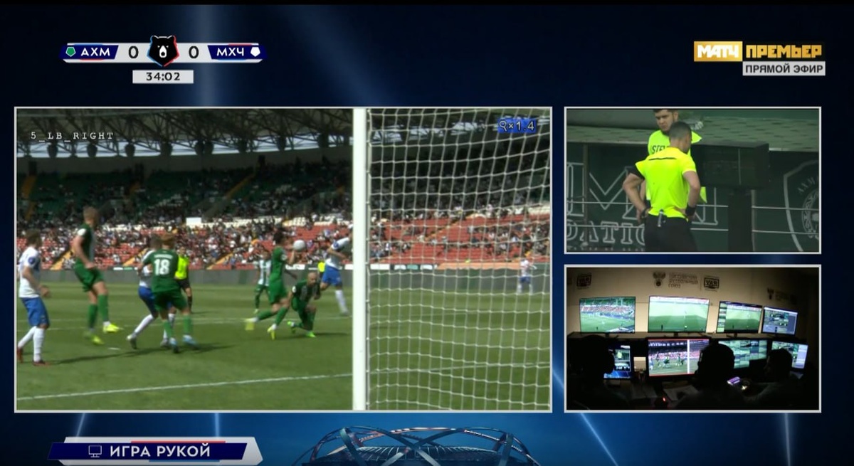 Ахмат-Динамо Мх 33 мин. Ошибается Бобровский и не назначает 11-м удар в ворота команды Ахмат за игру рукой Меняет свое решение после просмотра ВАР. Правильное решение: 11-м удар за игру рукой