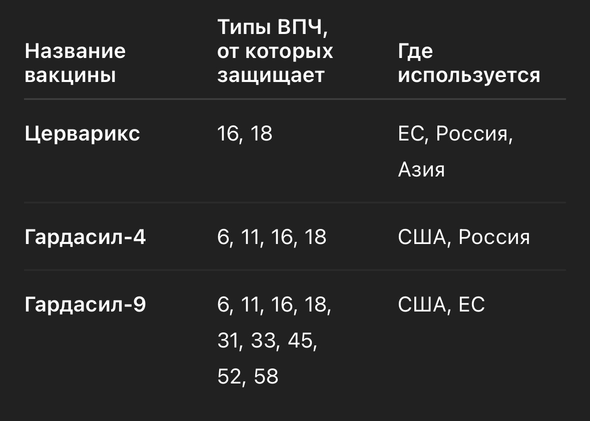 Вирус папилломы человека (ВПЧ) — это не просто “что-то там про бородавки”. Это один из главных виновников рака шейки матки и других онкологических заболеваний, от которых теперь можно защититься одной прививкой. Причём не только девочек, но и мальчиков. На сегодняшний день в мире зарегистрированы и широко применяются 3 вакцины от ВПЧ: В России чаще всего доступны Гардасил-4 и Церварикс. Вакцинация от ВПЧ: ВОЗ, ЮНИСЕФ, CDC, Минздрав РФ — все крупные медицинские организации рекомендуют её до начала половой жизни, но вакцина может быть полезной и позже.