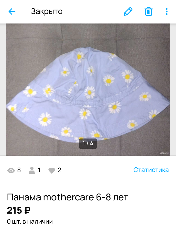 Всем здравствуйте! Случились у меня тут две прям противоположные продажи детских аксессуаров: один на осень-зиму, а второй на летнюю жару. Первый лот - это панамка для девочки от моей много лет нежно обожаемой mothercare. Тут не удивительно, лето совсем скоро. Нашла ее у себя в комоде. Дочери уже 12 лет панама на 6-8 лет, но она не маломерка, скорее наоборот, так что сколько она у меня лежала в комоде и не знаю. Обычно я только бейсболки продавала отдельно, типа nike, puma и т.д. Панамы ни разу, наверное. Выставила за небольшие 215 рублей (немного пожадничала и включила в цену комиссию сразу при публикации). Заказали быстро, цена приятная, тонкий хлопок, состояние отличное. Заказ с нескольких просмотров, очень такое люблю. Быстро получена, кстати, заказали снова 5post. И хороший отзыв мне написали. И минус мои новые 6 % комиссии. В итоге 203 рубля. И вторая вещь - шерстяные перчатки reima - долговисы. Цена символическая, б/у, состояние хорошее. А всё почему, торопилась я от