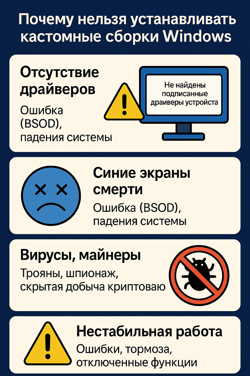 кастомные сборки Windows, скачать Windows бесплатно, лучшие сборки виндовс, Windows без мусора, виндовс без телеметрии, Windows без активации, проблемы при установке Windows, сборка Zver, сборка Ghost Spectre, Windows 10 LTSC Compact, Windows Mini OS, MicroWin, оригинальный образ Windows, официальная Windows ISO, скачать Windows с официального сайта, Rufus создание флешки Windows, ошибки при установке Windows, не найдены подписанные драйверы устройства, BSOD Windows (синий экран смерти), Windows тормозит, Windows не загружается, потеря данных в Windows, вирусы в сборках Windows, трояны и майнеры в Windows, безопасная установка Windows, как записать ISO Windows на флешку, VPN для скачивания Windows, скачать проверенный образ Windows, активатор Windows, пиратская Windows, почему не ставится Windows, нестабильная работа Windows, проблемы с драйверами Windows, сборки виндовс торрент, взломанная Windows, лицензия Windows дёшево, ключ активации Windows, почему Windows тормозит после установки, официальный сайт Microsoft для скачивания Windows, проверенные образы Windows скачать бесплатно, проблемы кастомных сборок Windows, легальная активация Windows, оригинальные образы Windows без вирусов, как избежать ошибок установки Windows, Windows не видит жёсткий диск при установке