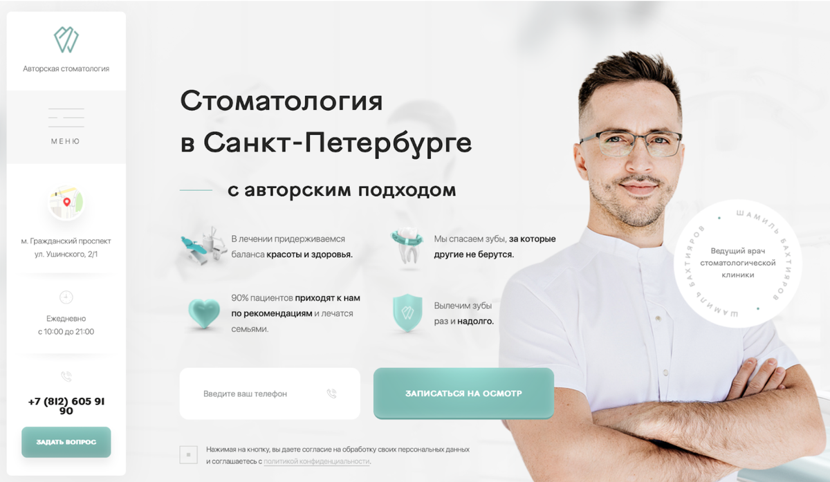 У Шамиля Бахтиярова была мечта: создать стоматологическую клинику, где каждого пациента будут обслуживать не как «очередного в кресле», а как особенного гостя. С этой идеей он работал несколько лет, постепенно выстраивая команду и нарабатывая лояльных клиентов. Но проблема была в том, что узнаваемость клиники ограничивалась лишь социальными сетями. Когда люди искали стоматолога через «Google» или «Яндекс», «Авторскую стоматологию» не находили. Шамиль понимал: без полноценного сайта он теряет большую часть аудитории, которая привыкла искать медицинские услуги именно в поисковиках, изучать подробности, читать о технологии лечения и опыте врачей. К тому же, в современной стоматологии нужно показывать и «картинку» — оборудование, сертификаты, результаты до и после, чтобы пациенты доверяли. Мы начинали с простой задачи: «Нужен сайт, который расскажет обо всем, что мы умеем, и при этом сохранит наш теплый, «авторский» стиль». С одной стороны — нужно структурировать море информации: терапия,
