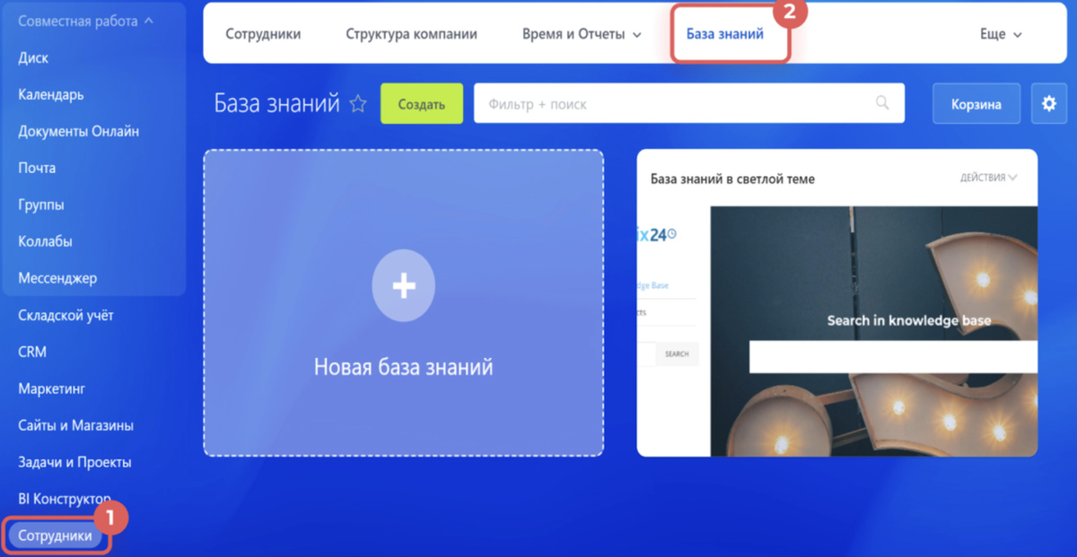 В Битрикс24 база знаний создаётся и ведётся прямо внутри платформы, являясь частью единого рабочего пространства. Это позволяет накапливать информацию естественным образом и легко передавать опыт новым сотрудникам.