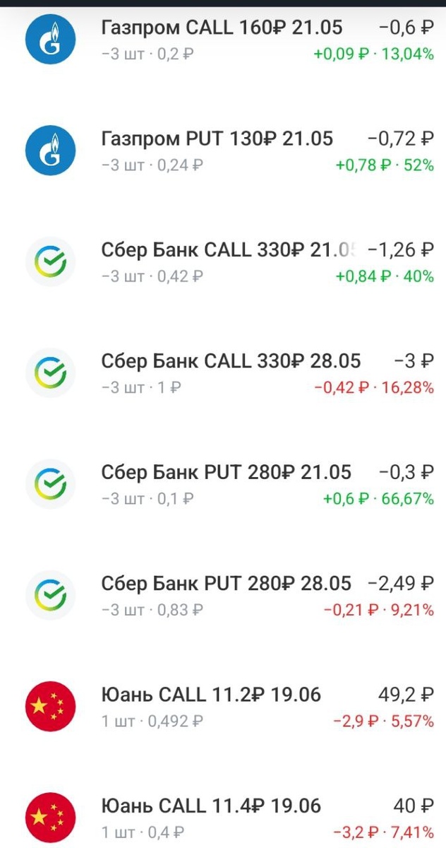 Продолжаем #угадайопцион Сейчас куплены опционы: CNY Call11.2 , Call11.4 И короткие стрэнглы из опционов Сбер и Газпром Результаты на скрине. Берем три актива, Юань, Сбер, Газпром Юань - месячный опцион - т.е. сейчас с исполнением 19.06 Сбер и Газпром - недельные опционы, с исполнением 28 мая. В угадайке можно , по акциям указывать вариант диапазона недельного хождения цены и/или выше/ниже какого страйка цена не уйдет. По юаню по прежнему пишем вариант цены закрытия актива к указанной дате и какой это опцион - Put (цена упадет до определенного значения) или Сall (цена вырастет до определенного значения). А я куплю указанные опционы - Юань - 1 шт, Сбер - 3 шт, Газпром - 3 шт. Т.е. сегодня можно писать вариант покупки на акции с исполнением на 28 мая, а на юань 19 июня. Варианты опционов по Сберу На рост: |310 | 320 | 330 | На падение: 300| 290 | 280 | Варианты опционов по Газпрому На рост: 145 |140 | На падение: 135 | 130 | Варианты опционов по Юаню На рост: 11.2 | 11.4| На паде